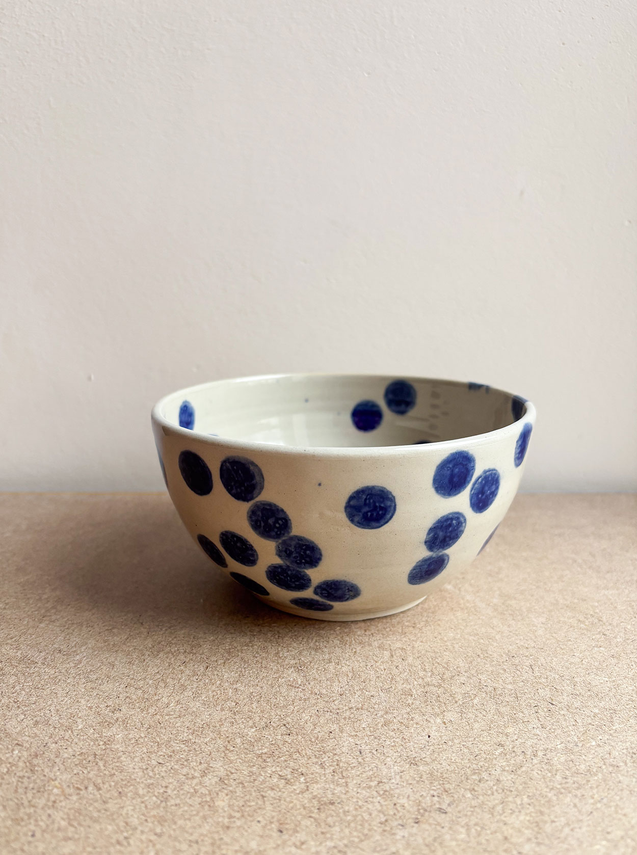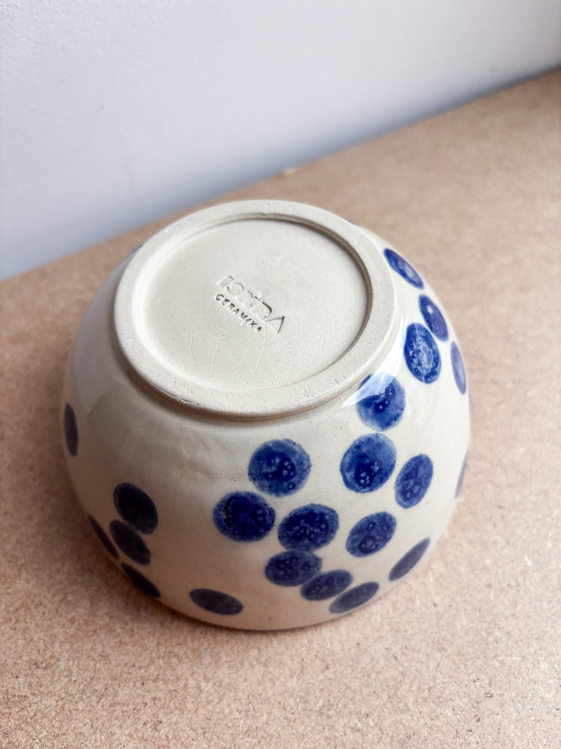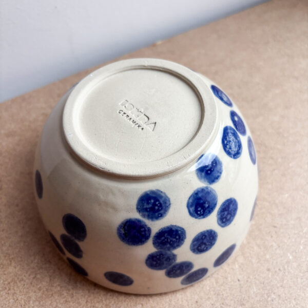 Miska o prostym kształcie, z kobaltowym ręcznym rysunkiem kropek, które przypominają rozsypane jagody. Pokryta transparentnym, błyszczącym szkliwem. Sprawdzi się jako miska śniadaniowa.